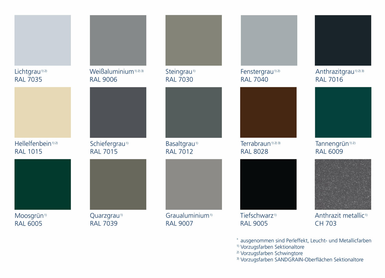 Unsere Schwing- und Sektionaltore sowie Nebentüren erhalten Sie serienmäßig in Verkehrsweiß, zu besonders attraktiven Konditionen in weiteren 15 Vorzugsfarben und rund 200 Farben aus dem RAL-Farbsystem*.