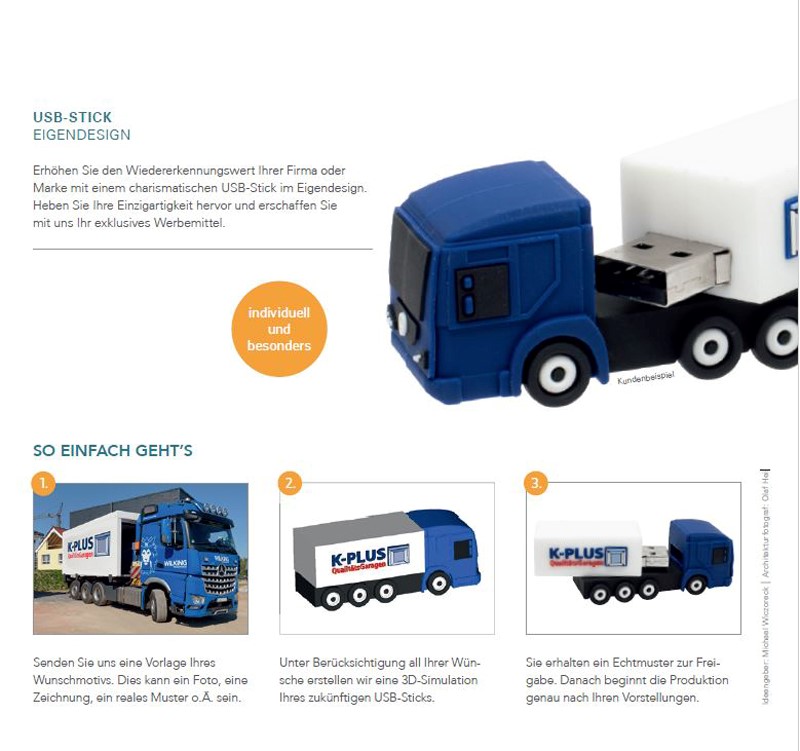 In der Rubrik USB-Sticks mit Eigendesign wird das K-PLUS Projekt mit dem Vermerk „individuell und besonders“ vorgestellt. Das passt! K-PLUS freut sich sehr und bedankt sich bei den Beteiligten für die gute, kreative und zuverlässige Zusammenarbeit. Gerne wieder!